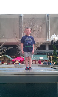 Here's a picture in front of the Convention Center on 4th street in Louisville. He's standing on a fountain that is shut down for the winter.